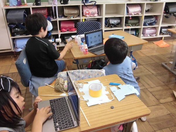 生活科「うごく うごく わたしのおもちゃ」の学習で、それぞれが作りたいおもちゃを考えて、より楽しめるおもちゃ作りをしました。