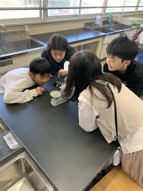 「消しゴムは何gくらいなんだろう?」と物を重さを量る使い方、「水が20gぴったり必要だ」と決まった重さを量る使い方の2種類を実践しました。