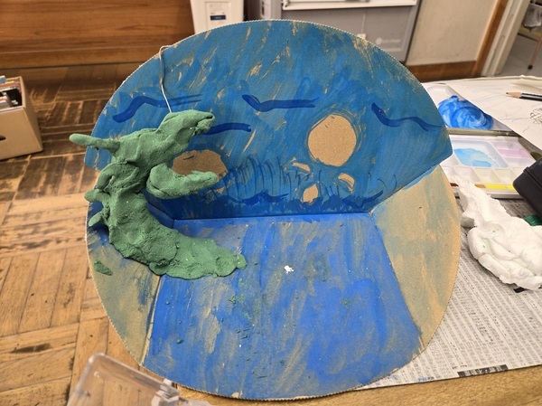 背景となる段ボールいっぱいに絵をかき、ねん土を使って上手に世界観を表現しています。