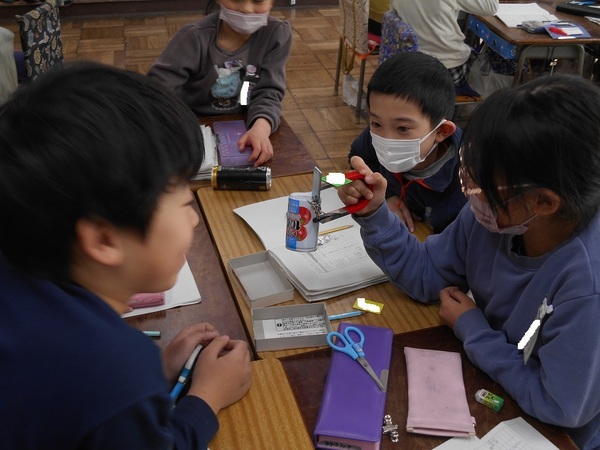前回までが電気を通す物について学習する単元であり、金属すべてにくっつくと予想する子どもたちが多い中、金属であっても鉄ではないものは磁石につかないことを体験し、実験を通して発見を得ることができました。